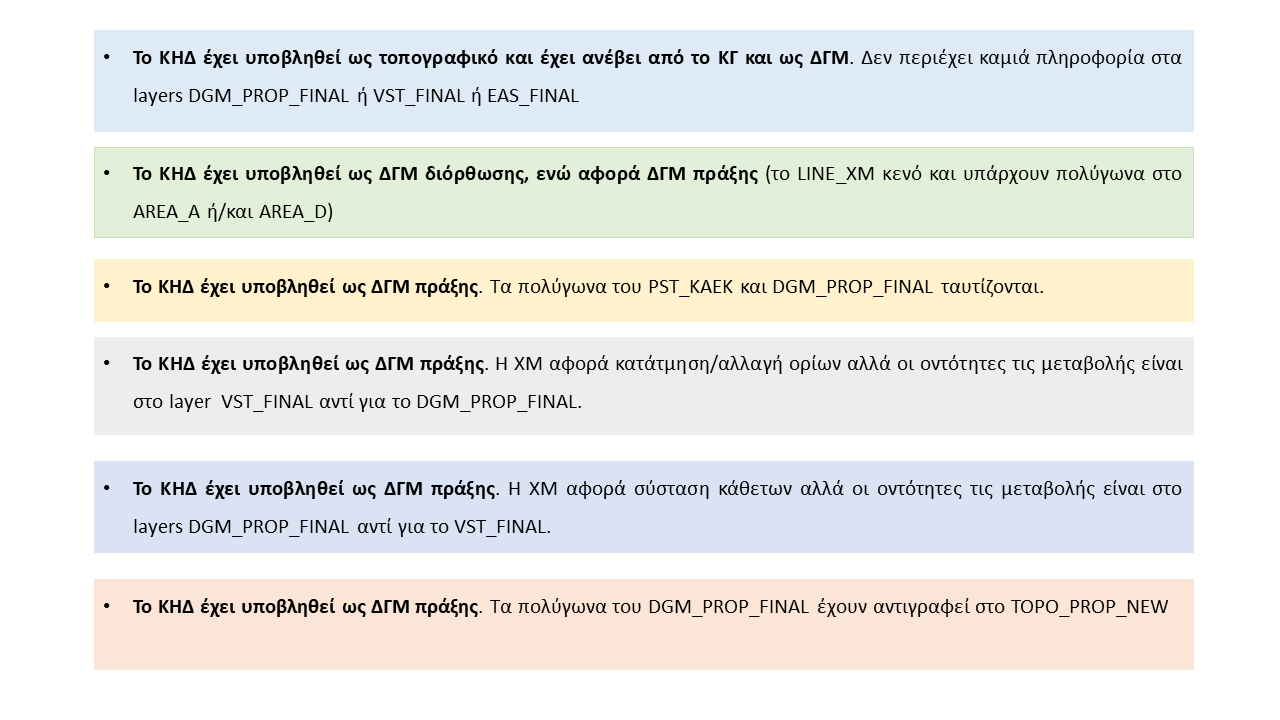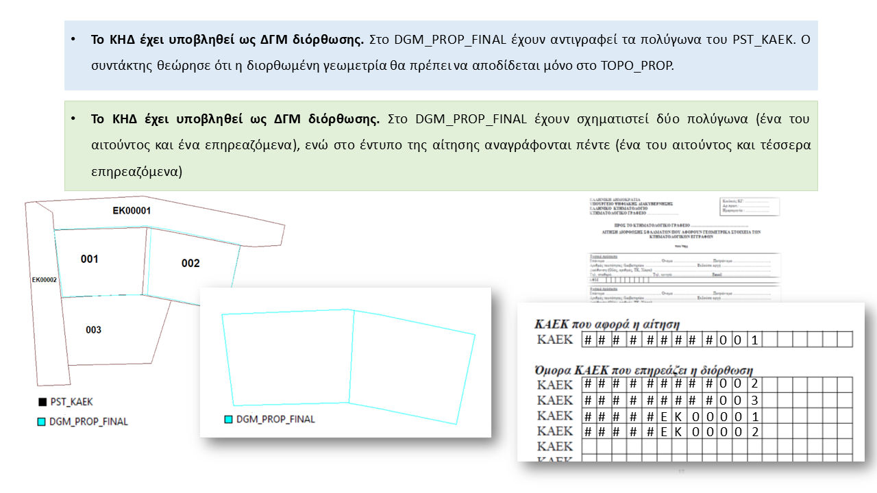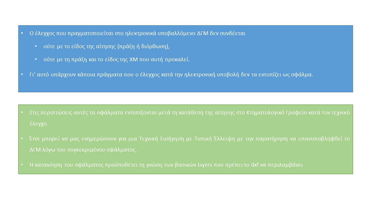 Η επιτυχής ηλεκτρονική υποβολή ενός διαγράμματος γεωμετρικών μεταβολών, δεν διασφαλίζει ότι το δγμ μπορεί να εφαρμοστεί. Παρατηρούνται λάθη που οφείλονται στη συσχέτιση του είδους της αίτησης με το δγμ ή και στη δομή των επιπέδων του ίδιου του δγμ. Η κατάληξη αυτών των αστοχίων είναι η ενημέρωση του μηχανικού από το Κτηματολογικό Γραφείο μέσω μιας Τεχνικής Εισήγησης στην οποία επισημαίνονται οι αστοχίες ως τυπική έλλειψη και η ανάγκη για επαναυποβολή του δγμ με νέο ΚΗΔ.