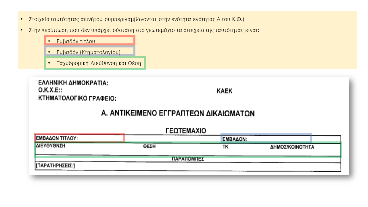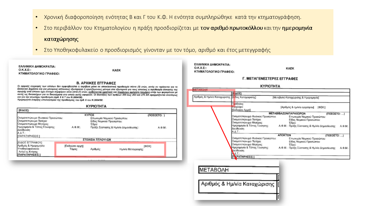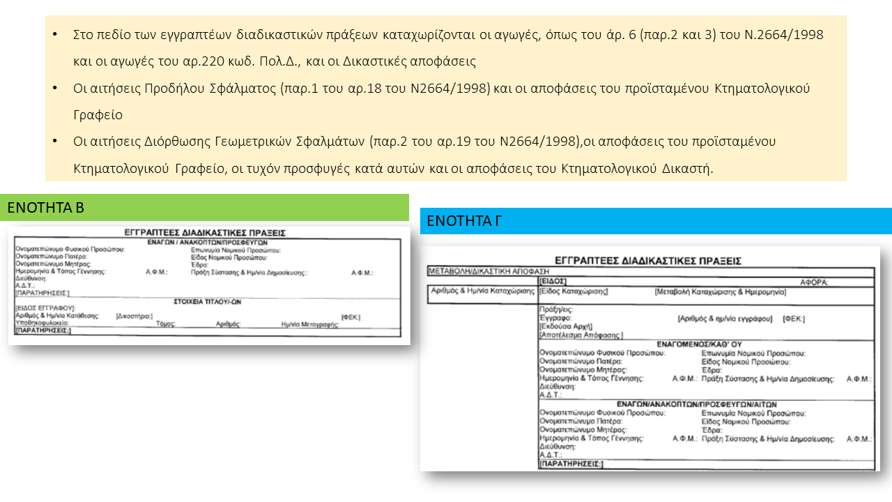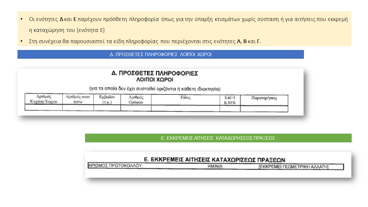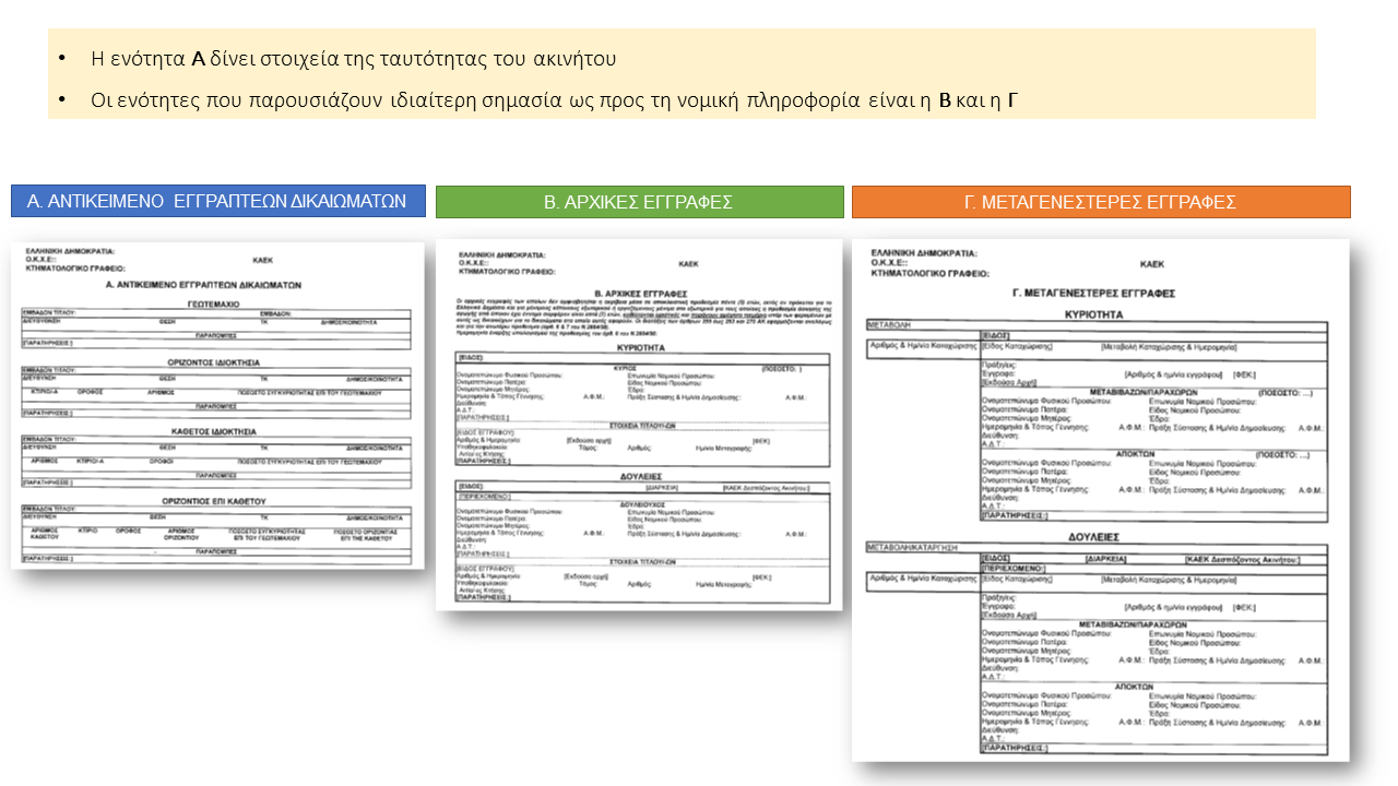 Στο Κ.Φ. εμπεριέχεται όλη η νομική πληροφορία για την κατάσταση του ακινήτου καθώς και στοιχεία από την ταυτότητα του. Κάθε Κ.Φ. διαρθρώνεται σε πέντε ενότητες (Α, Β, Γ, Δ και Ε):