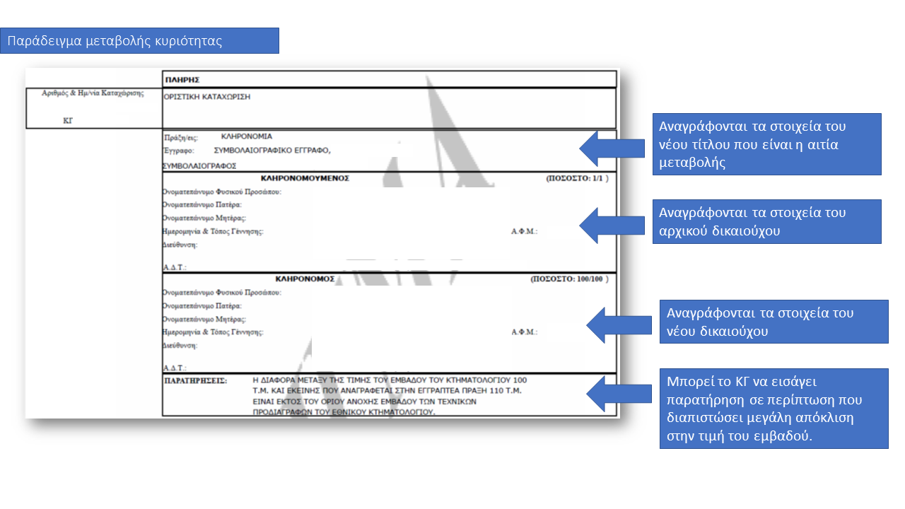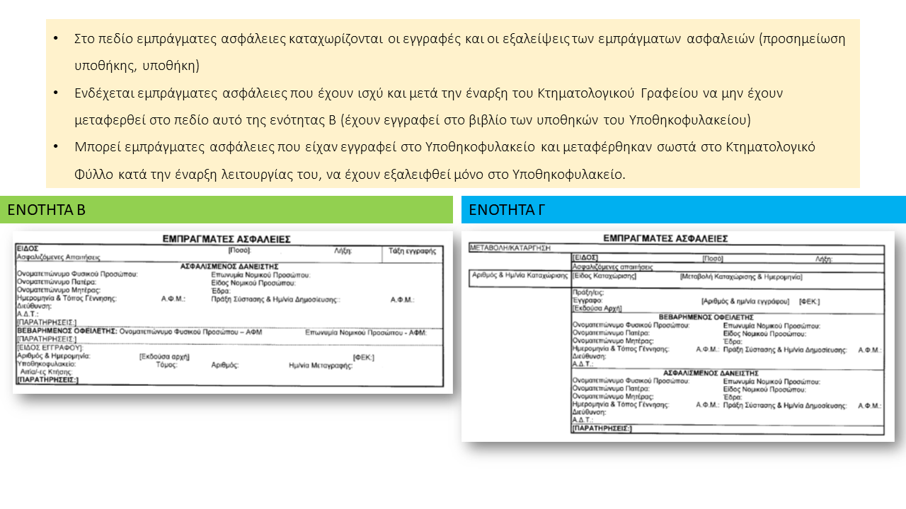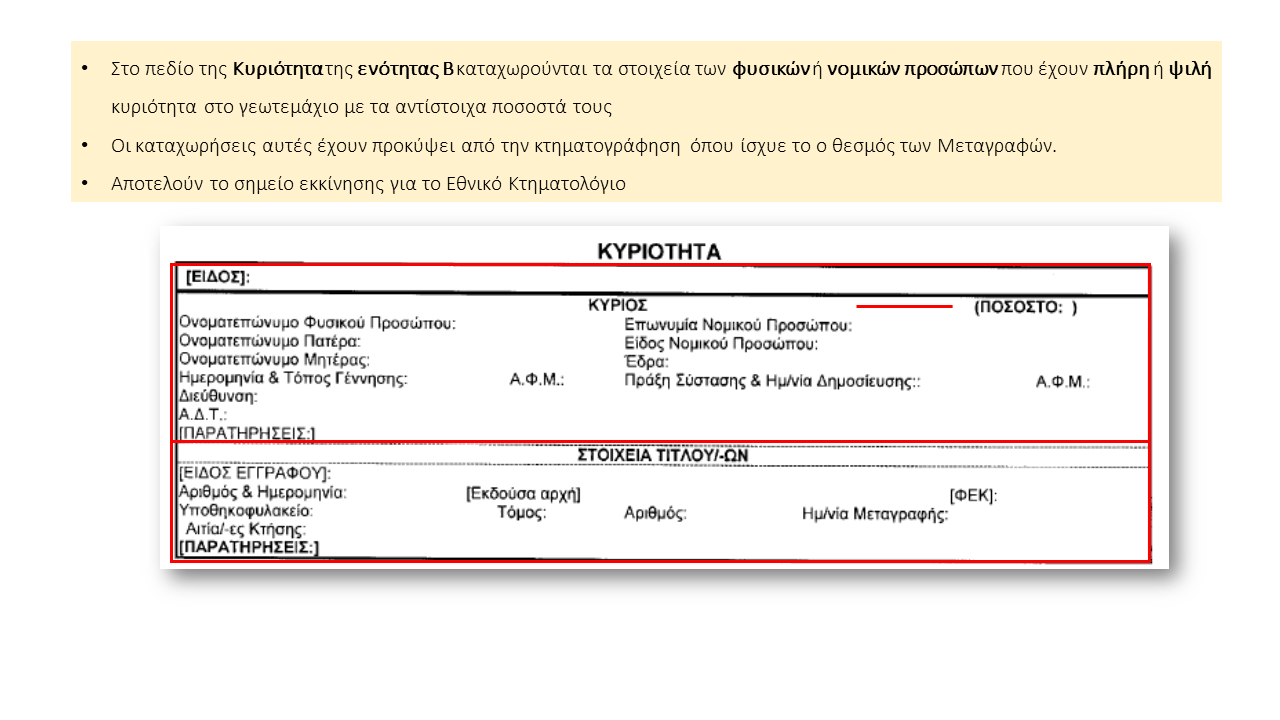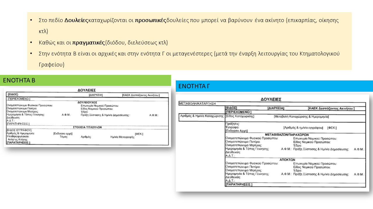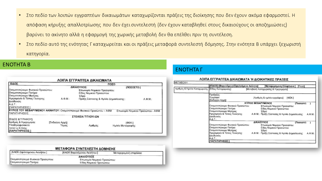Στο Κ.Φ. εμπεριέχεται όλη η νομική πληροφορία για την κατάσταση του ακινήτου καθώς και στοιχεία από την ταυτότητα του. Κάθε Κ.Φ. διαρθρώνεται σε πέντε ενότητες (Α, Β, Γ, Δ και Ε):