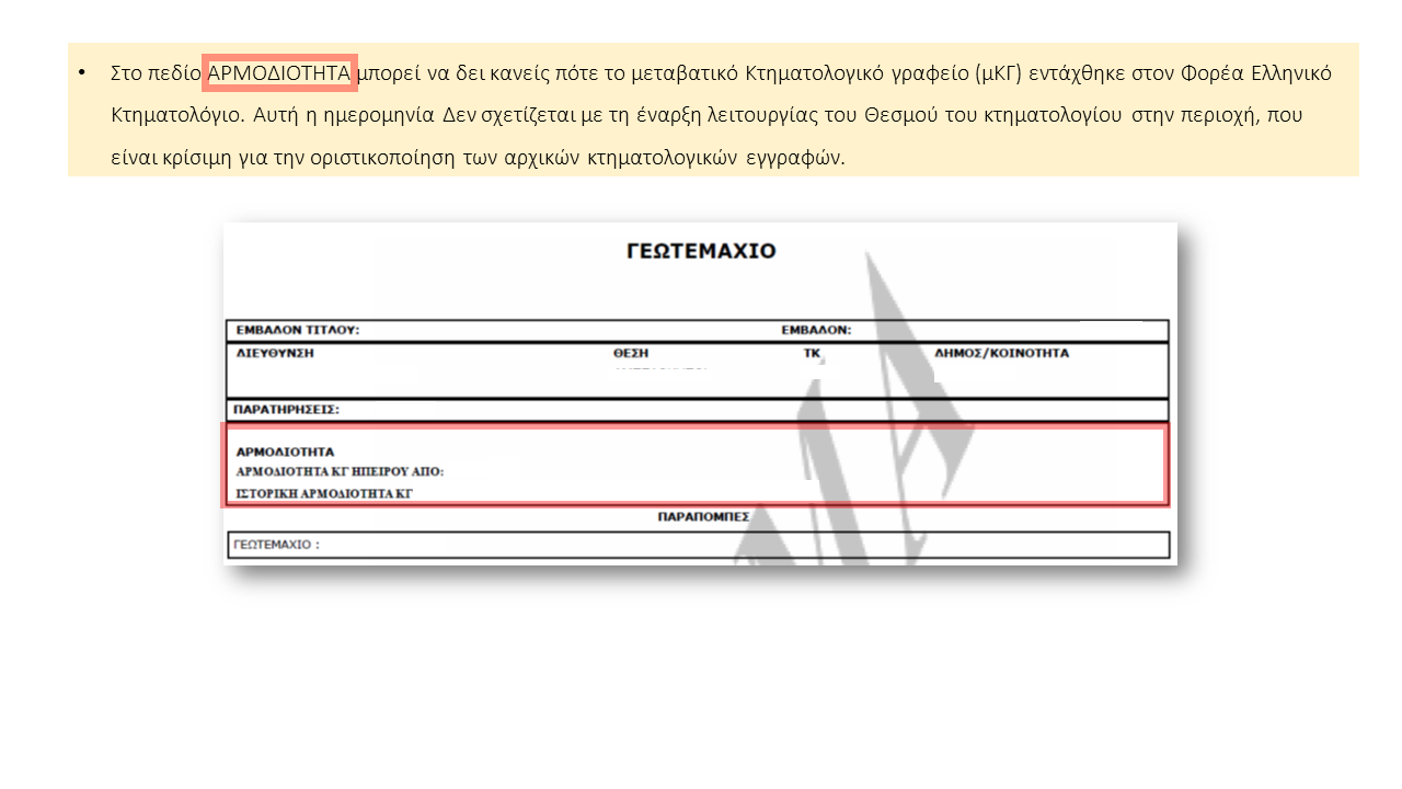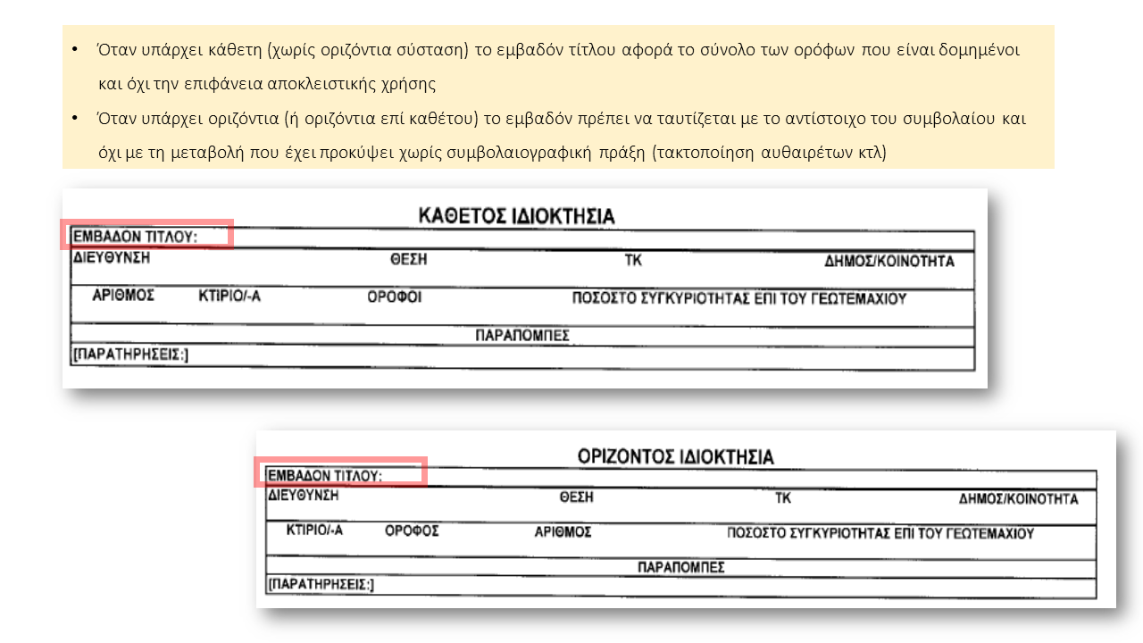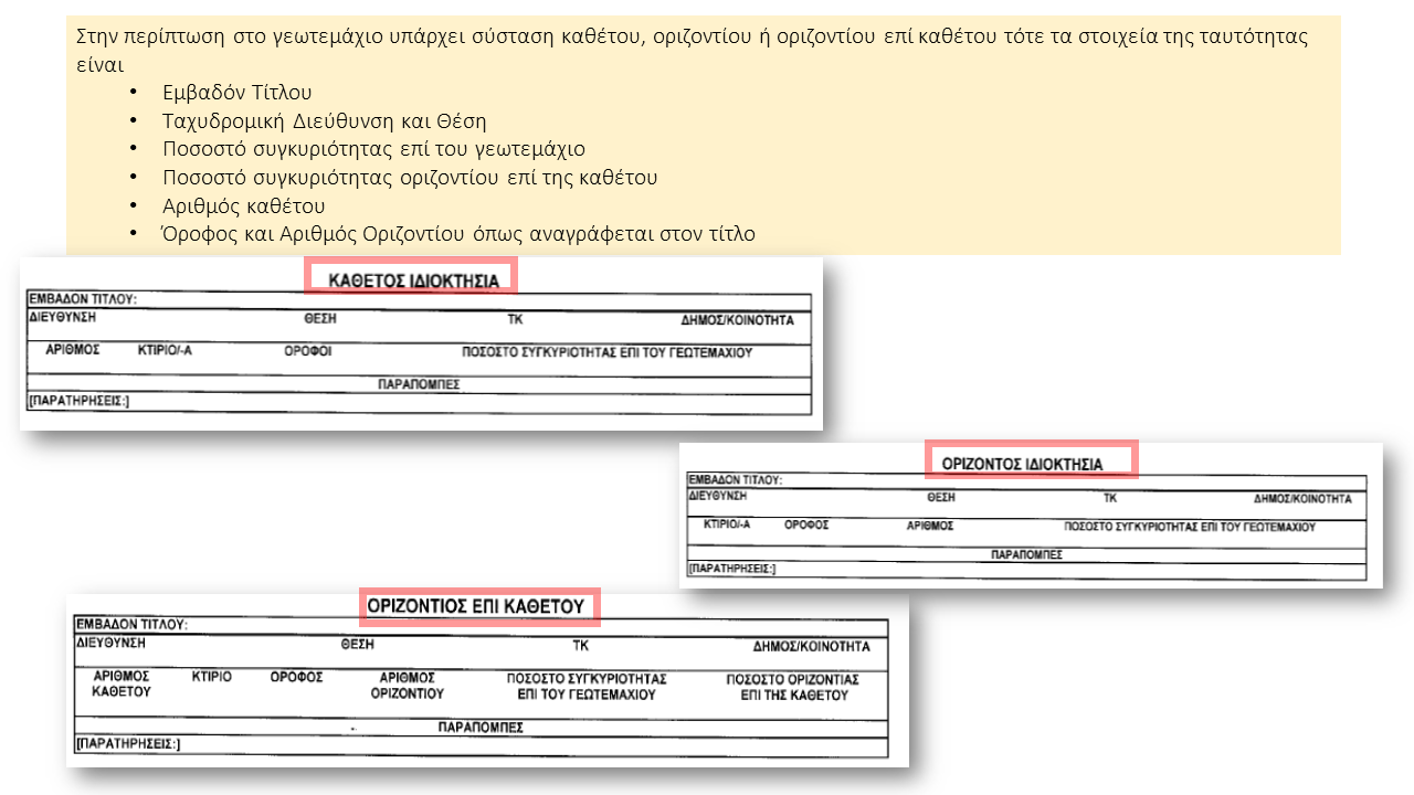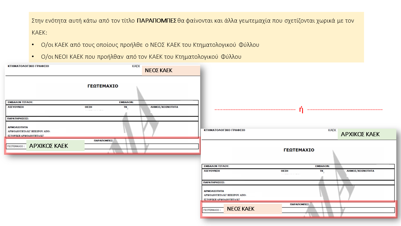 Κάθε ακίνητο αντιστοιχίζεται σε ένα Κτηματολογικό Φύλλο (Κ.Φ.).Το ακίνητο είναι γενικότερη έννοια από το γεωτεμάχιο. Mία οριζόντια ιδιοκτησία ορίζεται ως ακίνητο και έχει ξεχωριστό ΚΦ. Ο ΚΑΕΚ που αντιστοιχεί στο συγκεκριμένο ακίνητο και προσδιορίζει την οριζόντια ονομάζεται εκτεταμένος και έχει και τα 16 ψηφία. Το γεωτεμάχιο αντιστοιχεί στο γήπεδο, που συστήνεται η οριζόντια ιδιοκτησία (περιέχει την συγκεκριμένη οριζόντια), με ΚΑΕΚ τα 12 πρώτα ψηφία από τα 16 της οριζόντιας, τα οποία συνδέονται με το πολύγωνο του γηπέδου.