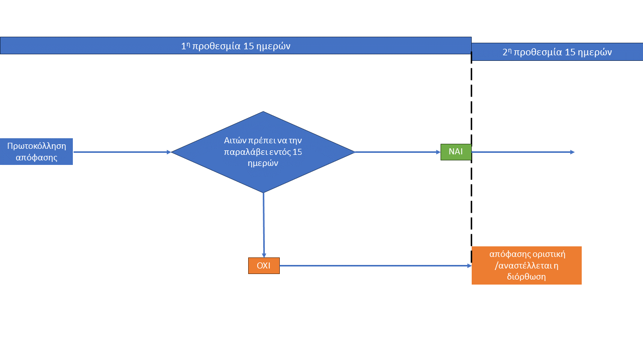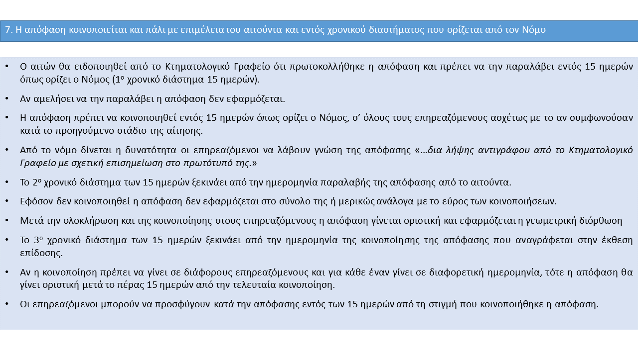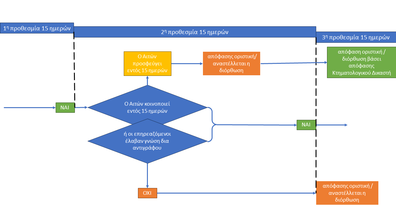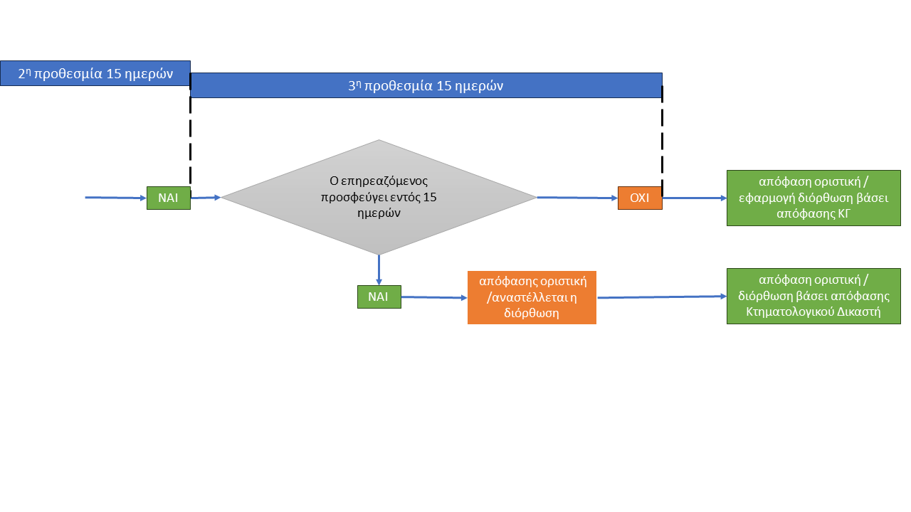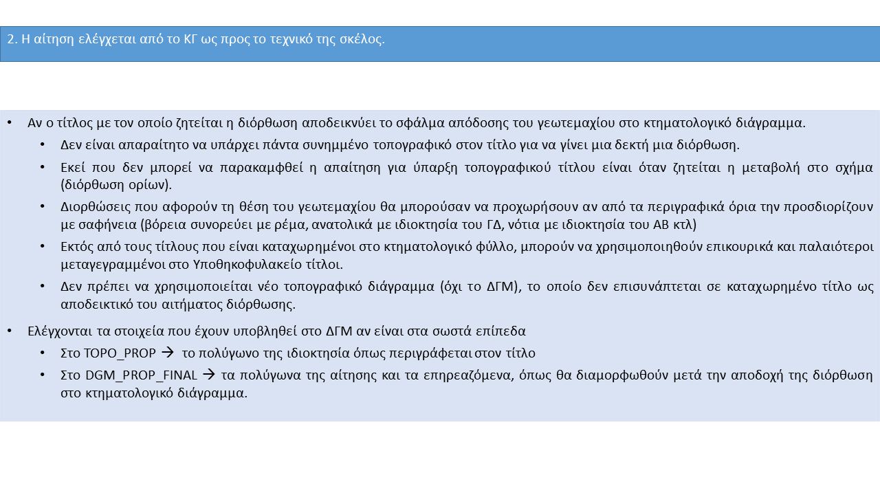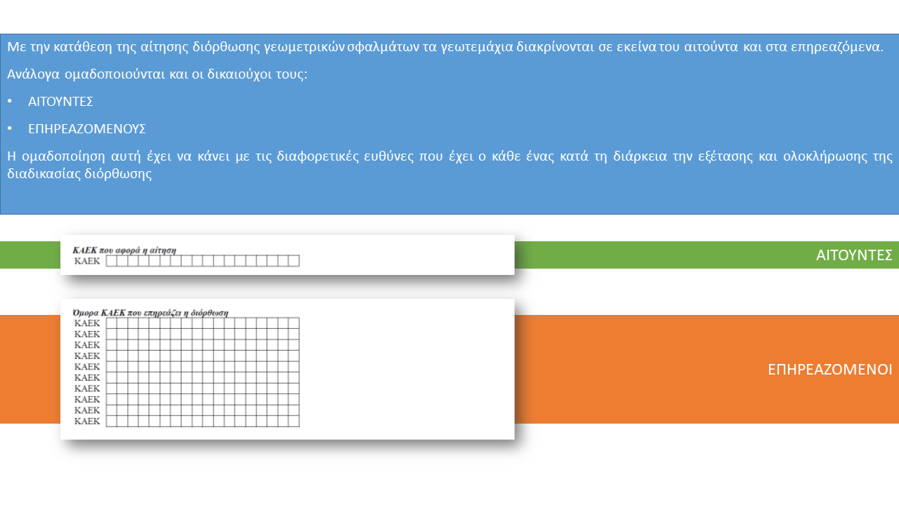 Η συμπλήρωση και η κατάθεση της αίτησης διόρθωσης γεωμετρικών σφαλμάτων είναι το πρώτο βήμα από μια σειρά άλλων που θα ακολουθήσουν μέχρι την αποδοχή της διόρθωσης. Η όλη διαδικασία μπορεί να διακριθεί σε δύο στάδια. Εκείνο του ελέγχου της αίτησης, που ολοκληρώνεται με την τεχνική εισήγηση και την κοινοποίηση της αίτησης, και εκείνο της απόφασης με την οποία θα κριθεί τελικά αν γίνει αποδεκτό ή όχι το αίτημα.