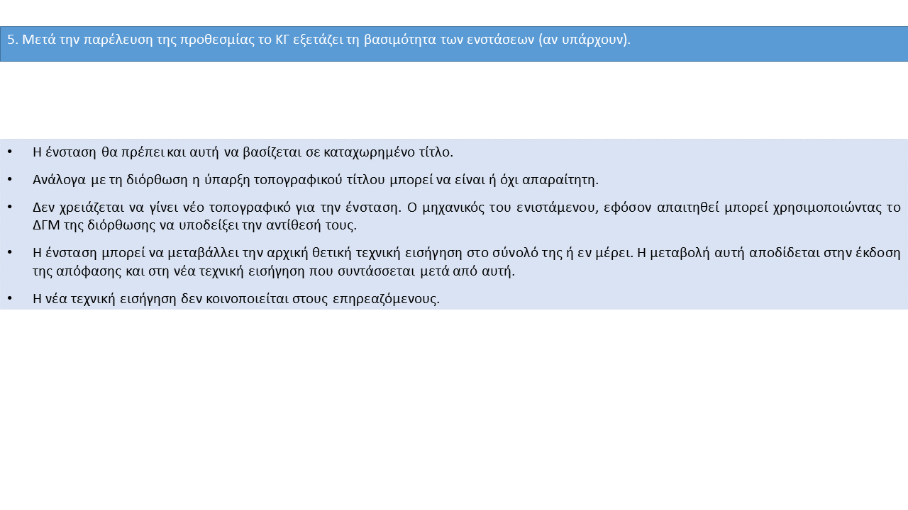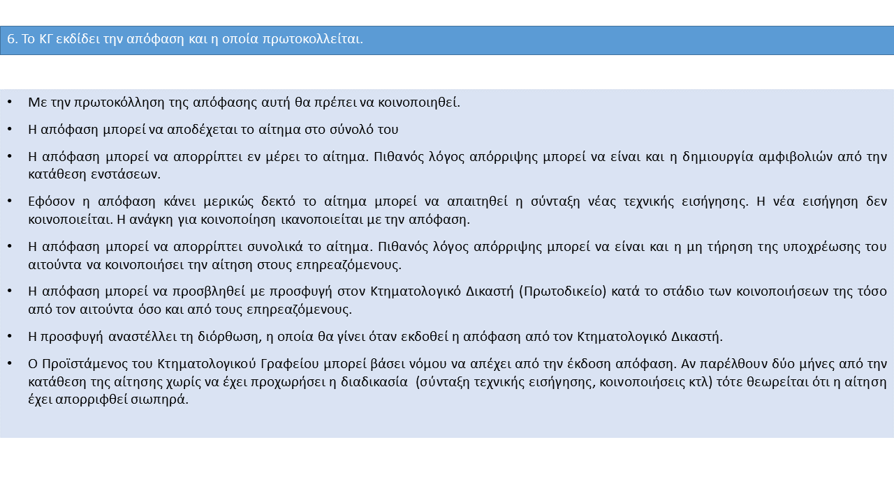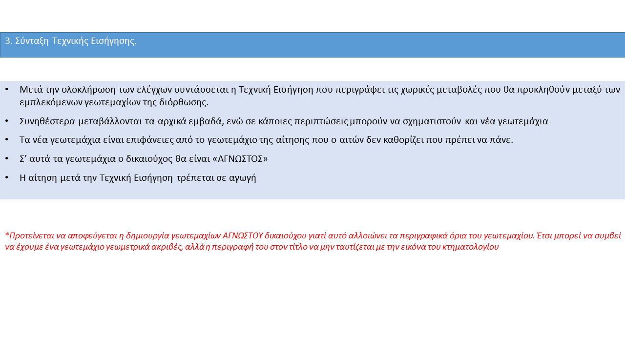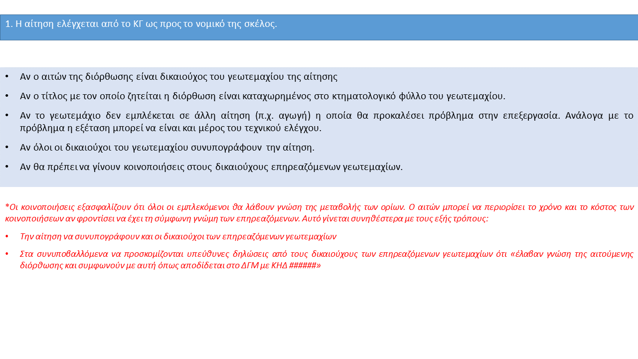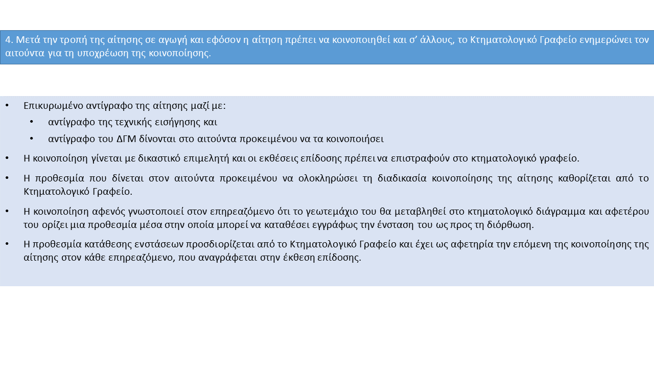 Με την τεχνική εισήγηση, που συντάσσεται στο πρώτο στάδιο, προκρίνεται η βασιμότητα ή όχι του αιτήματος. Αν αυτό κριθεί βάσιμο τότε η αίτηση τρέπται σε αγωγή και ο αιτών θα πρέπει να την κοινοποιήσει στους επηρεαζόμενους. Σημαντική παράμετρος τόσο για την διάρκεια ολοκλήρωσης της διόρθωσης, όσο και για την αποδοχή της αποτελούν οι κοινοποιήσεις τόσο της αίτησης όσο και της απόφασης. Επίσης οι κοινοποιήσεις προκαλούν και αύξηση του κόστους της διαδικασίας, ενώ η αδιαφορία για μη ολοκλήρωσή τους είναι λογός μερικής ή και συνολικής απόρριψης της αίτησης.